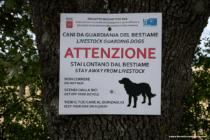This sign, in German, translates into English and warns of the presence of livestock-guarding dogs.